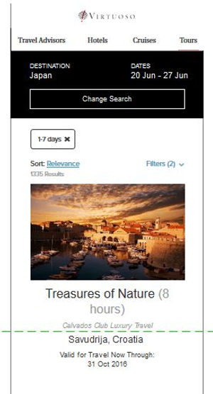 I redesigned Virtuoso's destination pages based on the new visual style we launched with the mobile site, but I left before I could advocate for and drive implementation of these new designs. I crafted them such that modules would automatically pull in editorial articles, travel products (hotels, cruises, and tours), and travel advisors based on existing metadata already associated with those objects. This would have enabled easy scaling for pages with lots of associated content (like the one in the example), all the way down to pages with only a single associated object.